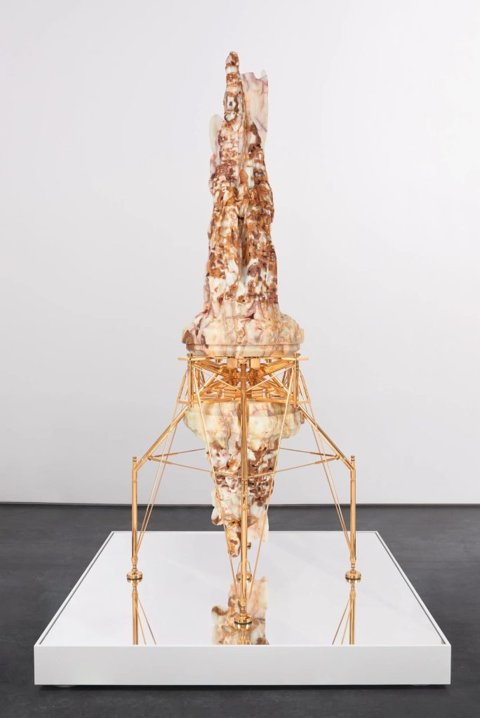 Barry X Ball, Enthroned Pope, Reflected, 2013–2024. Translucent “wounded” Mexican onyx, 24K gold-plated steel and aluminium, stainless steel base: lacquered solid aluminium, optical mirror, stainless steel