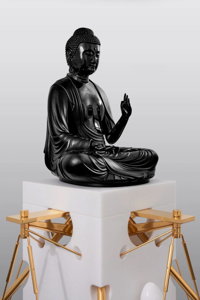 Barry X Ball, Buddha, 2018–2023. Belgian black marble; Vietnamese white marble penetrated plinth and Gogotte-form genitalia; 24K gold-plated metal